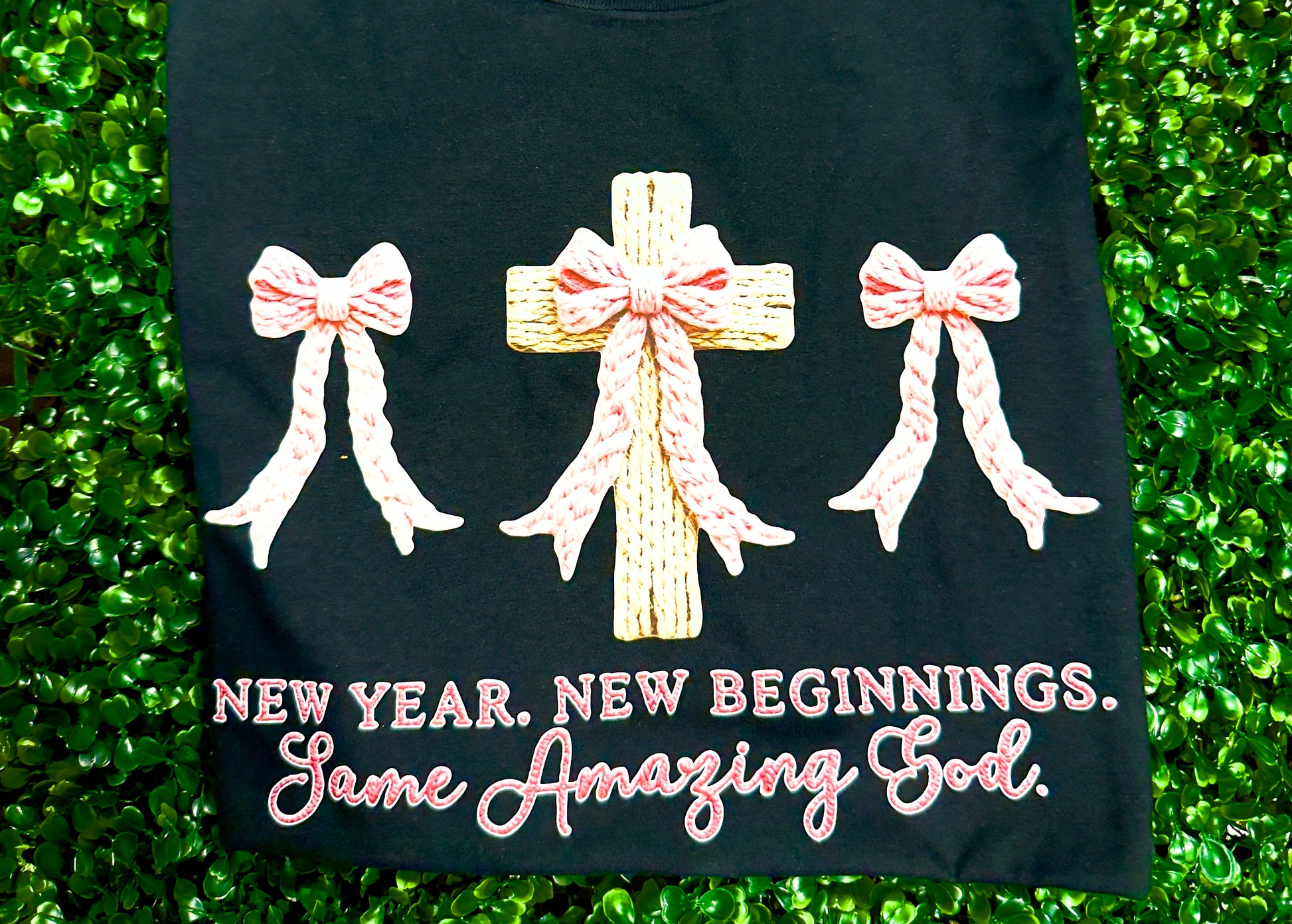 The bold, joyful text underneath reads: "NEW YEAR. NEW BEGINNINGS. Same Amazing God."—a perfect reminder of His constancy through every season of life.